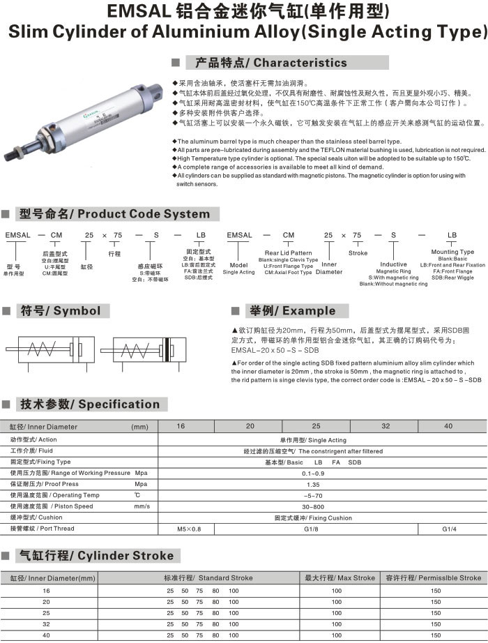 EMSAL铝合金迷你气缸(单作用型),EASUN亿日气动不锈钢气缸管,不锈钢气缸,气动气缸,气动导向气缸,不锈钢气动角座阀迷你气缸,tpm迷你气缸