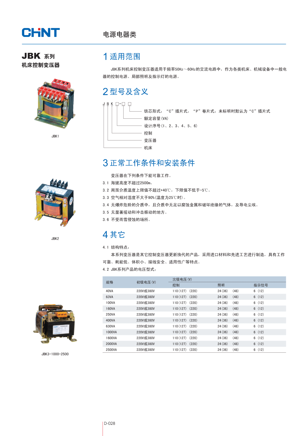 适用于频率50Hz~60Hz的交流电路中,作为各类机床、机械设备中一般电器的控制电源、局部照明及指示灯的电源