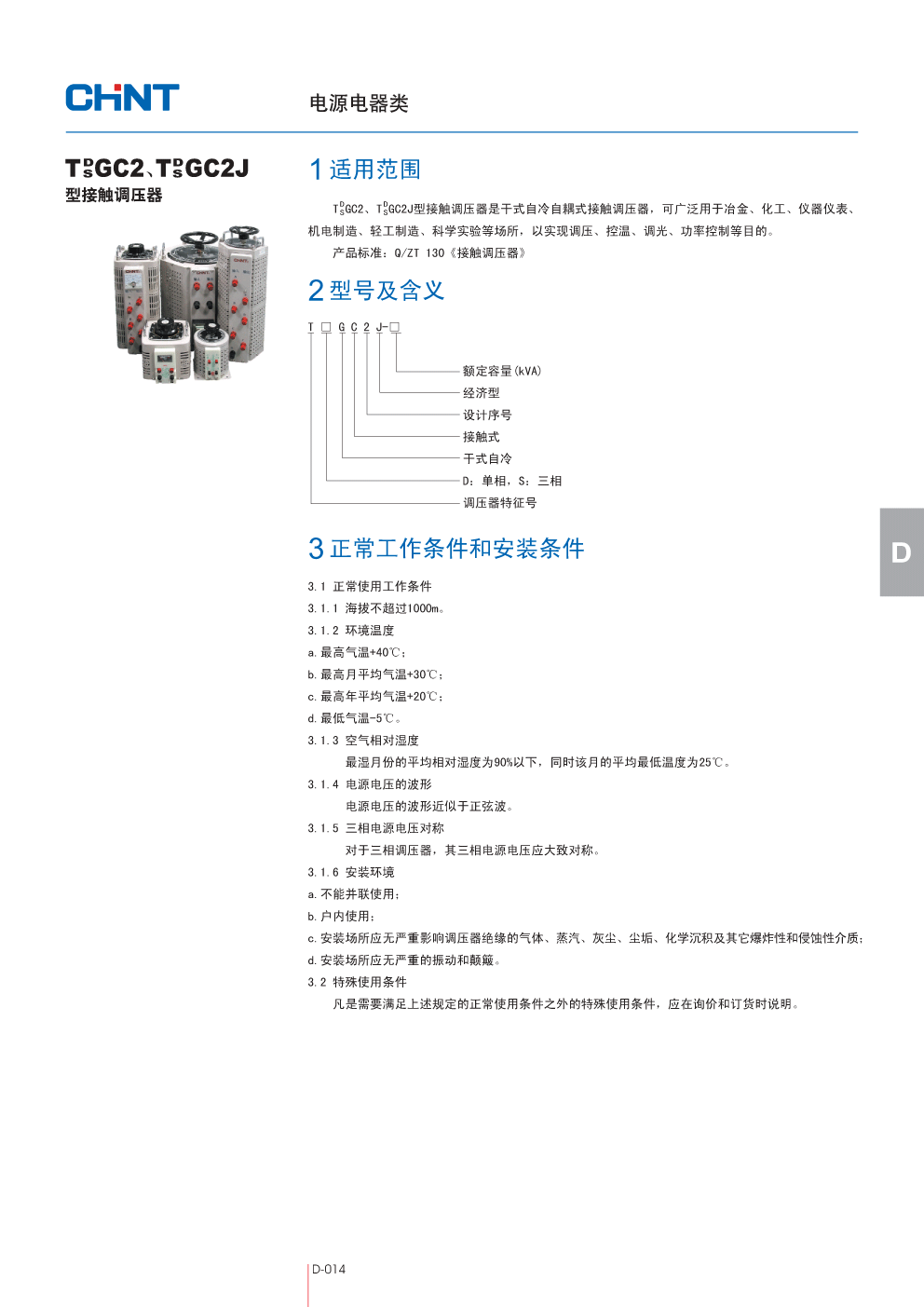 是干式自冷自耦式接触调压器,可广泛用于冶金、化工、仪器仪表、机电制造、轻工制造、科学实验等场所,以实现调压、控温、调光、功率控制等目的